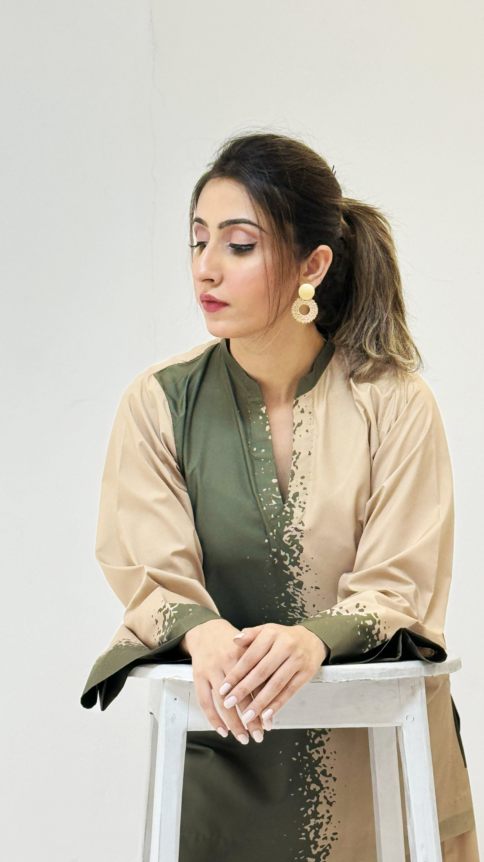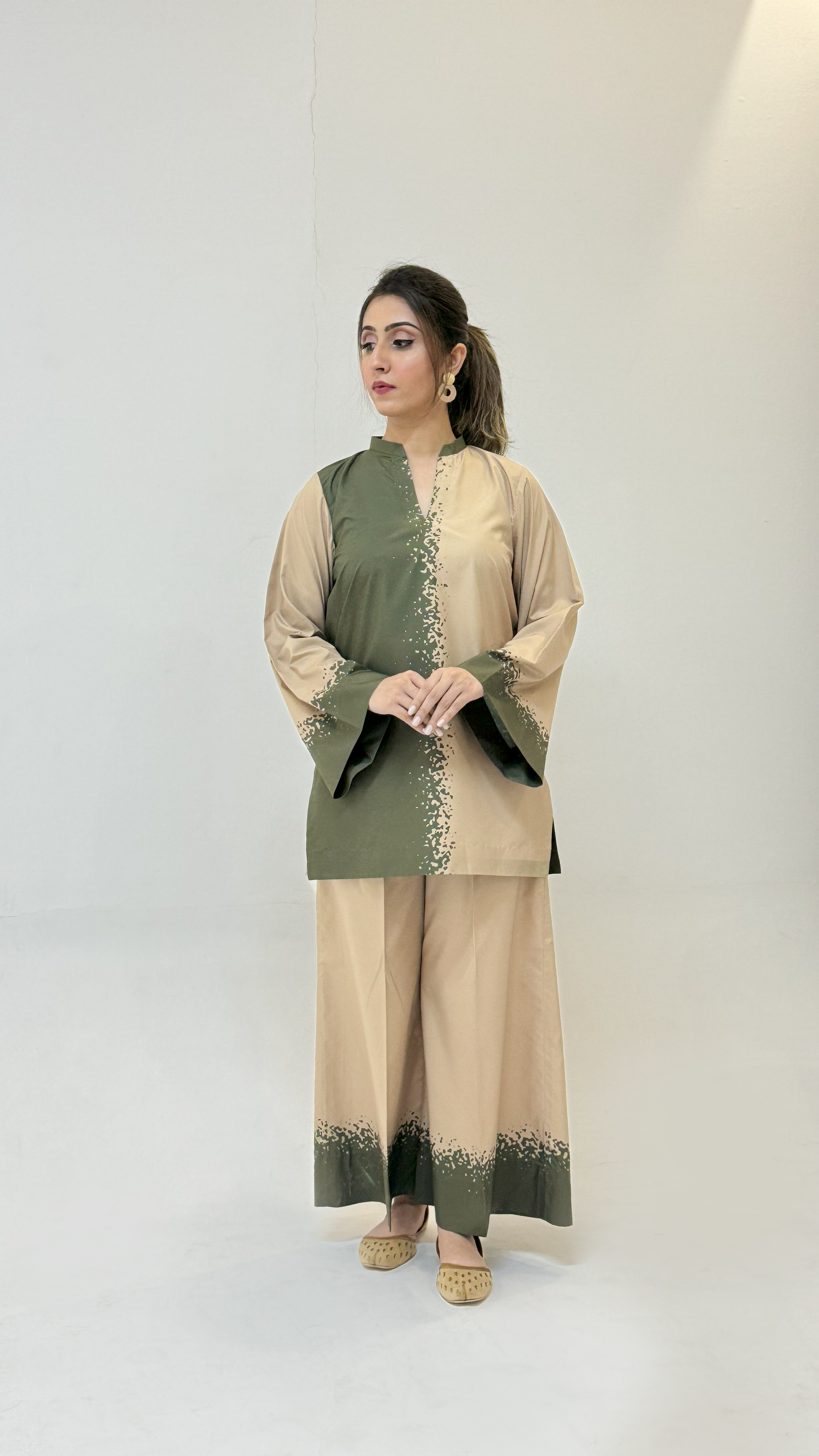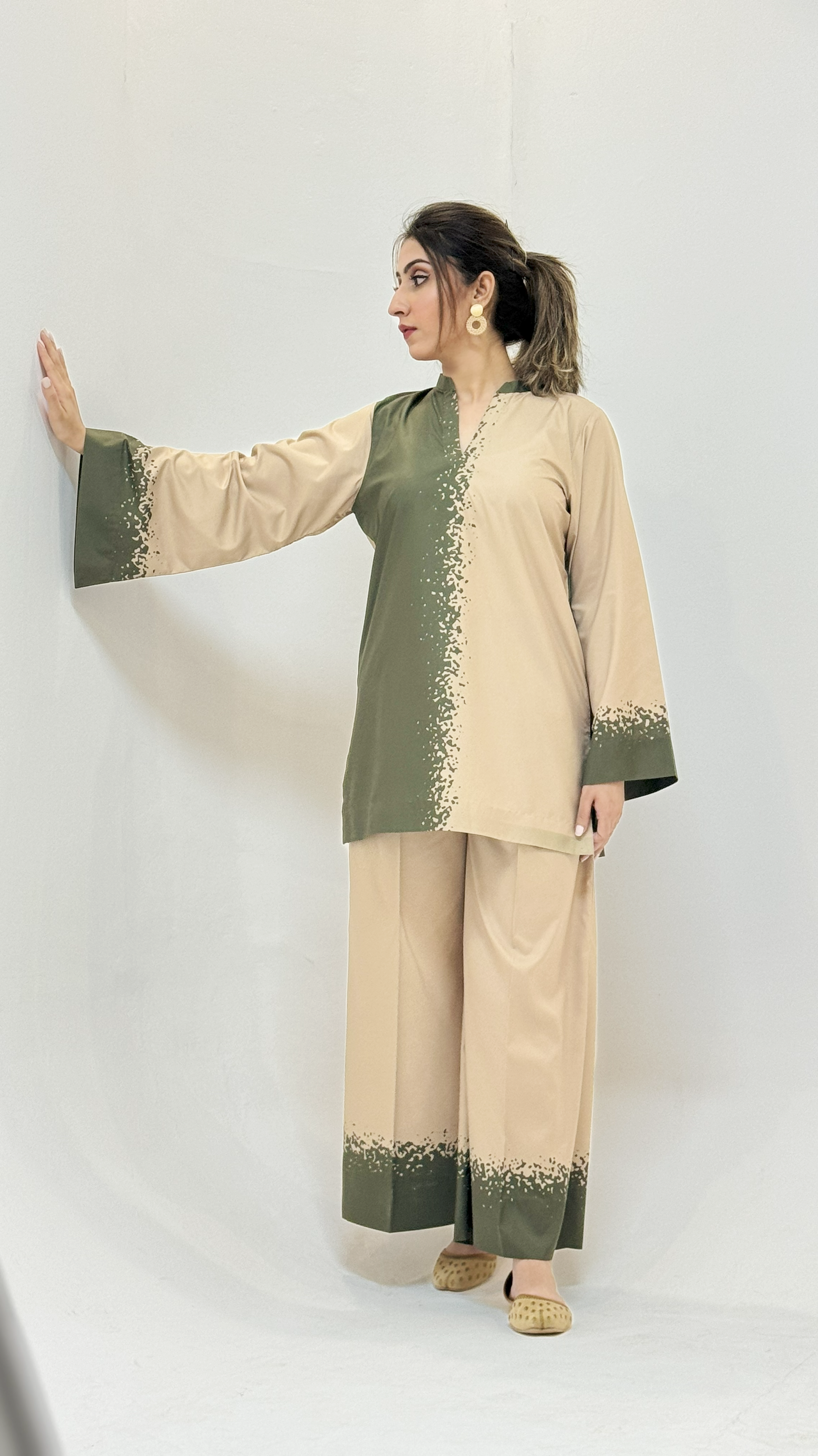 This dress features a two-toned design with olive green and beige colors, separated by a textured vertical pattern down the center. The loose-fitting kurta has wide sleeves and is paired with matching wide-legged pants for a comfortable yet stylish look.
