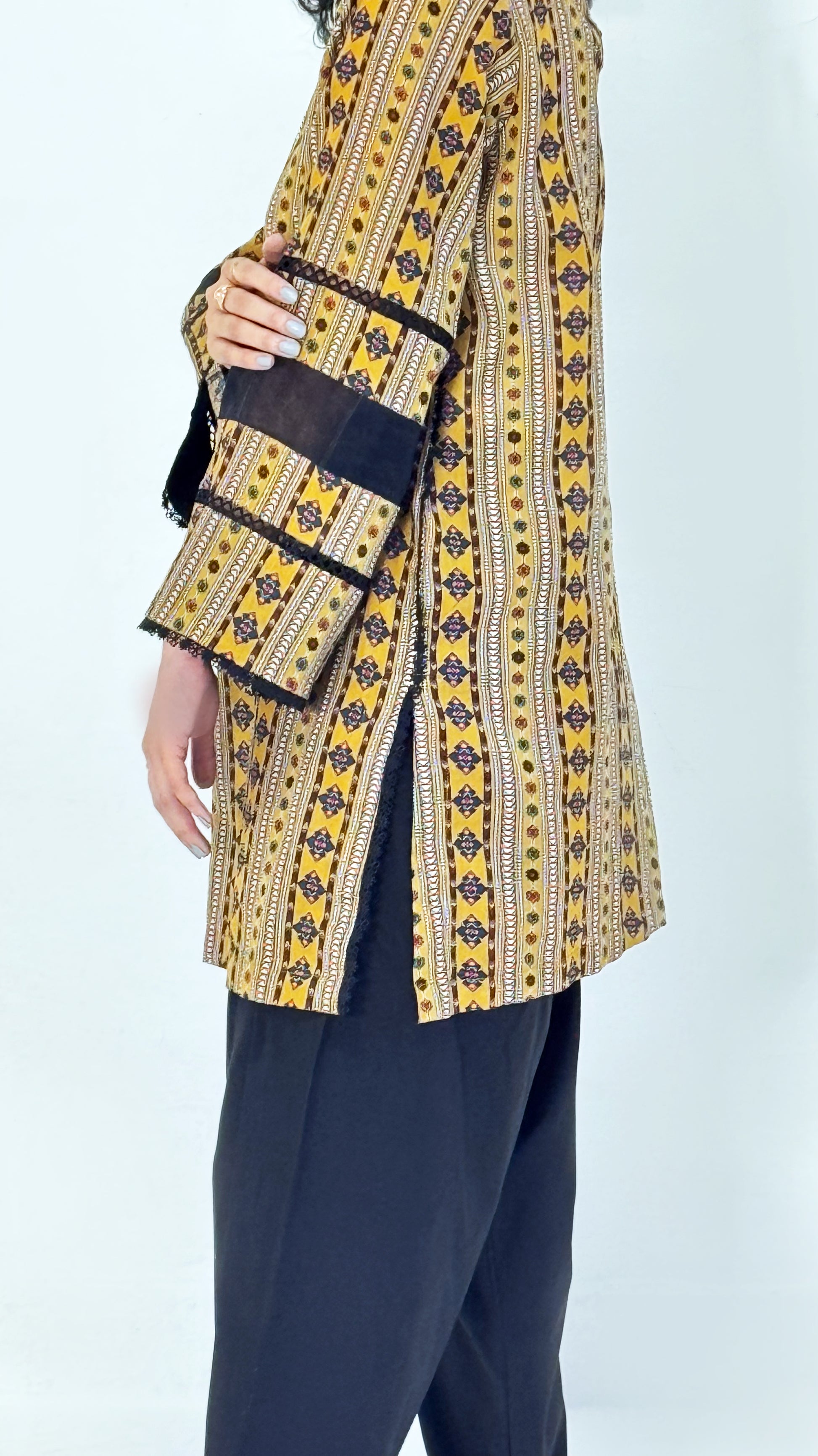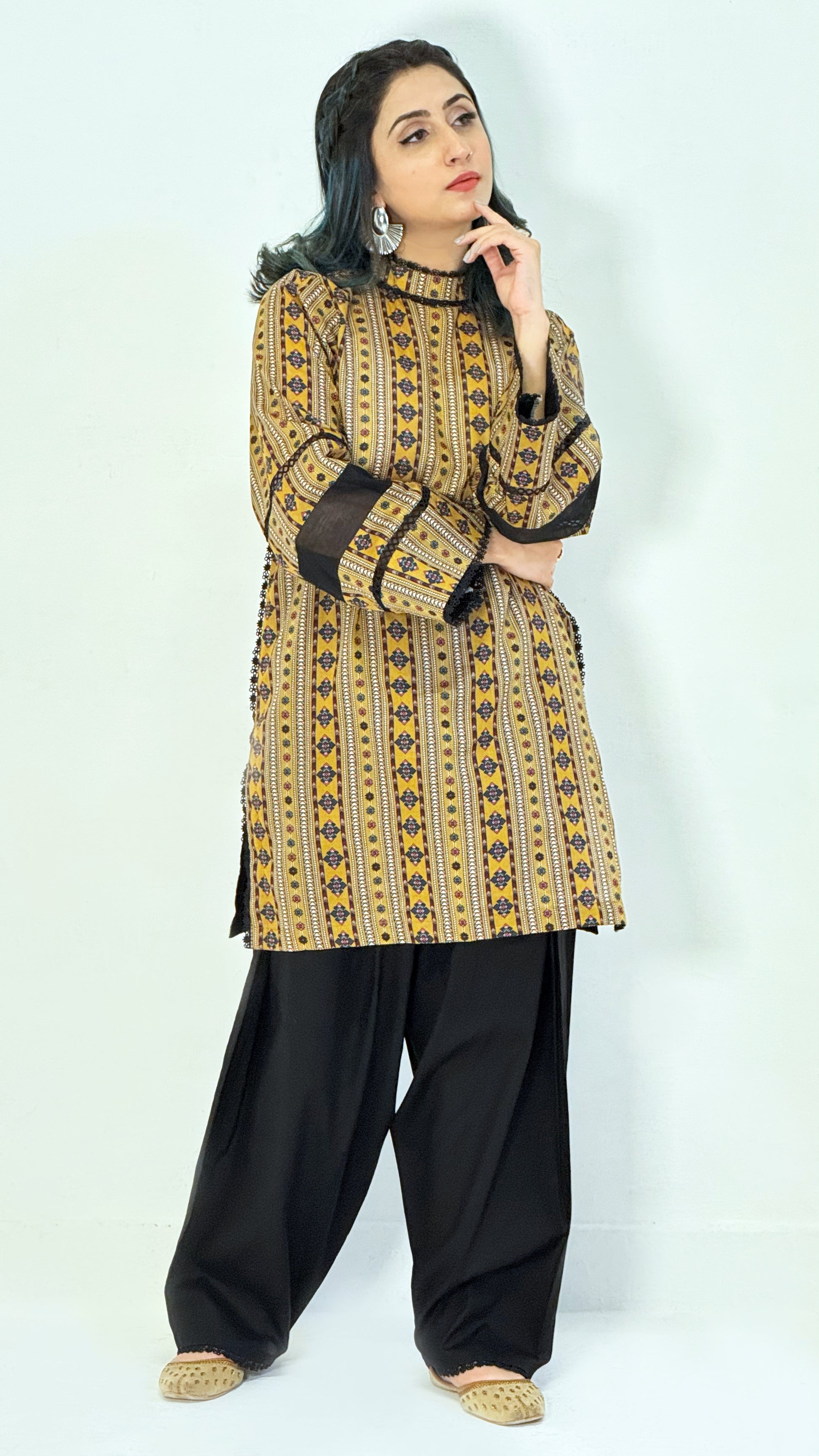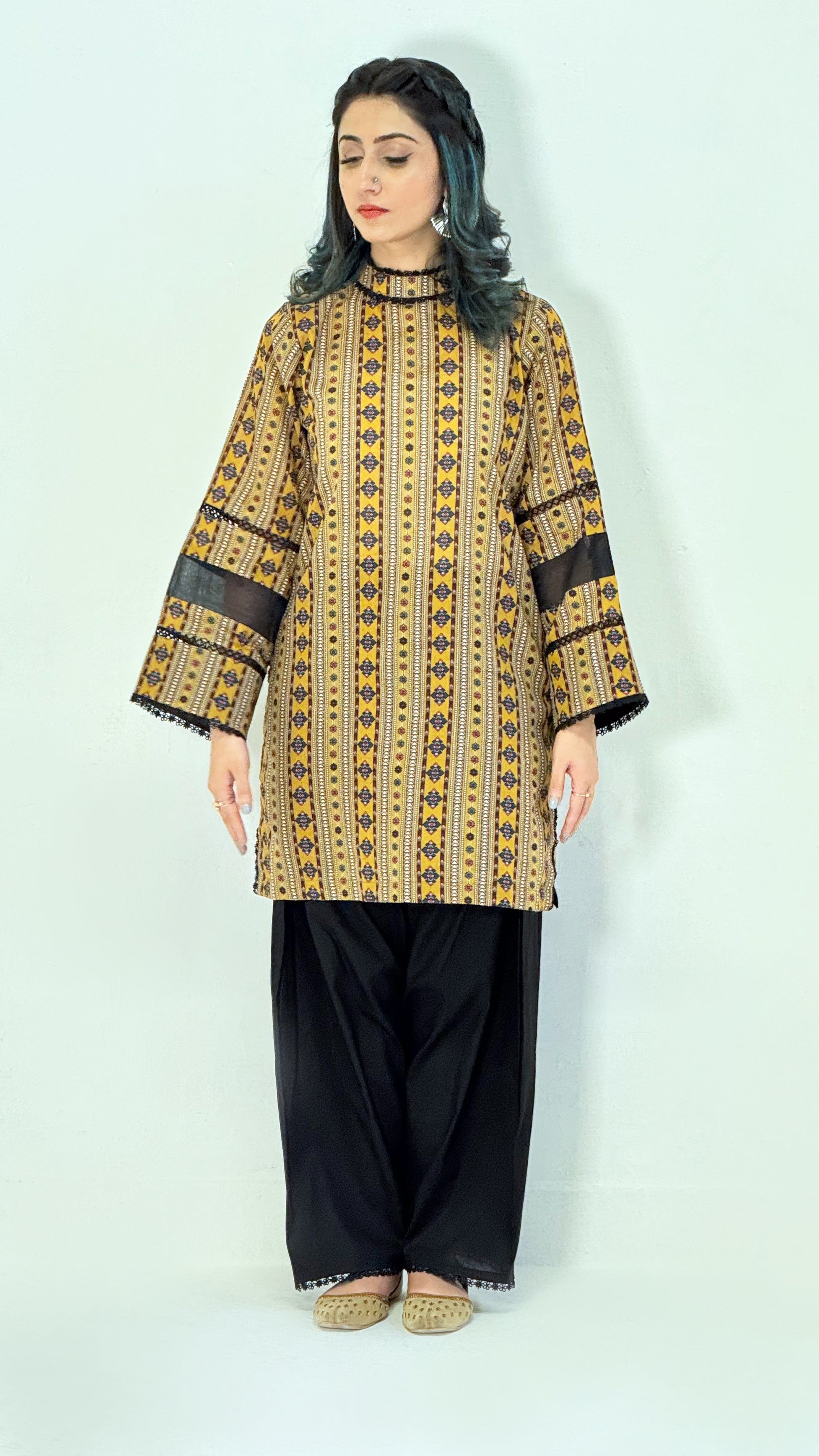 This 2-piece outfit features a traditional straight-cut shirt adorned with intricate tribal-inspired prints in mustard, black, and maroon tones. The shirt has a modest round neckline accentuated with lace detailing, adding a subtle yet graceful finish. Its wide bell sleeves are enhanced with sheer black organza panels and delicate lace trims, offering a modern twist to the ethnic design. Paired with solid black wide-leg shalwar that are soft, flowy, and finished with lace at the hem, this ensemble blends cultural richness with contemporary elegance.