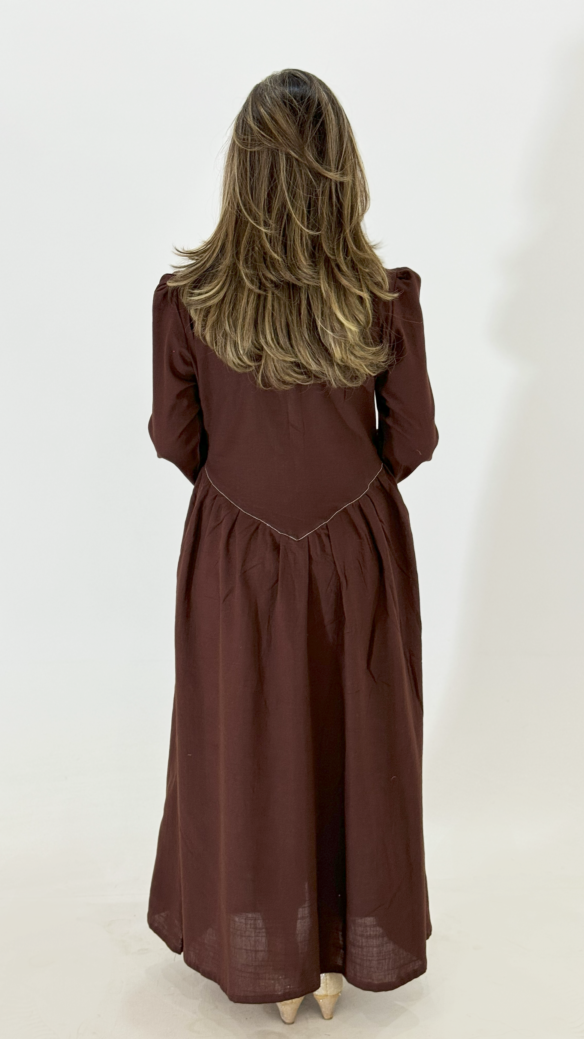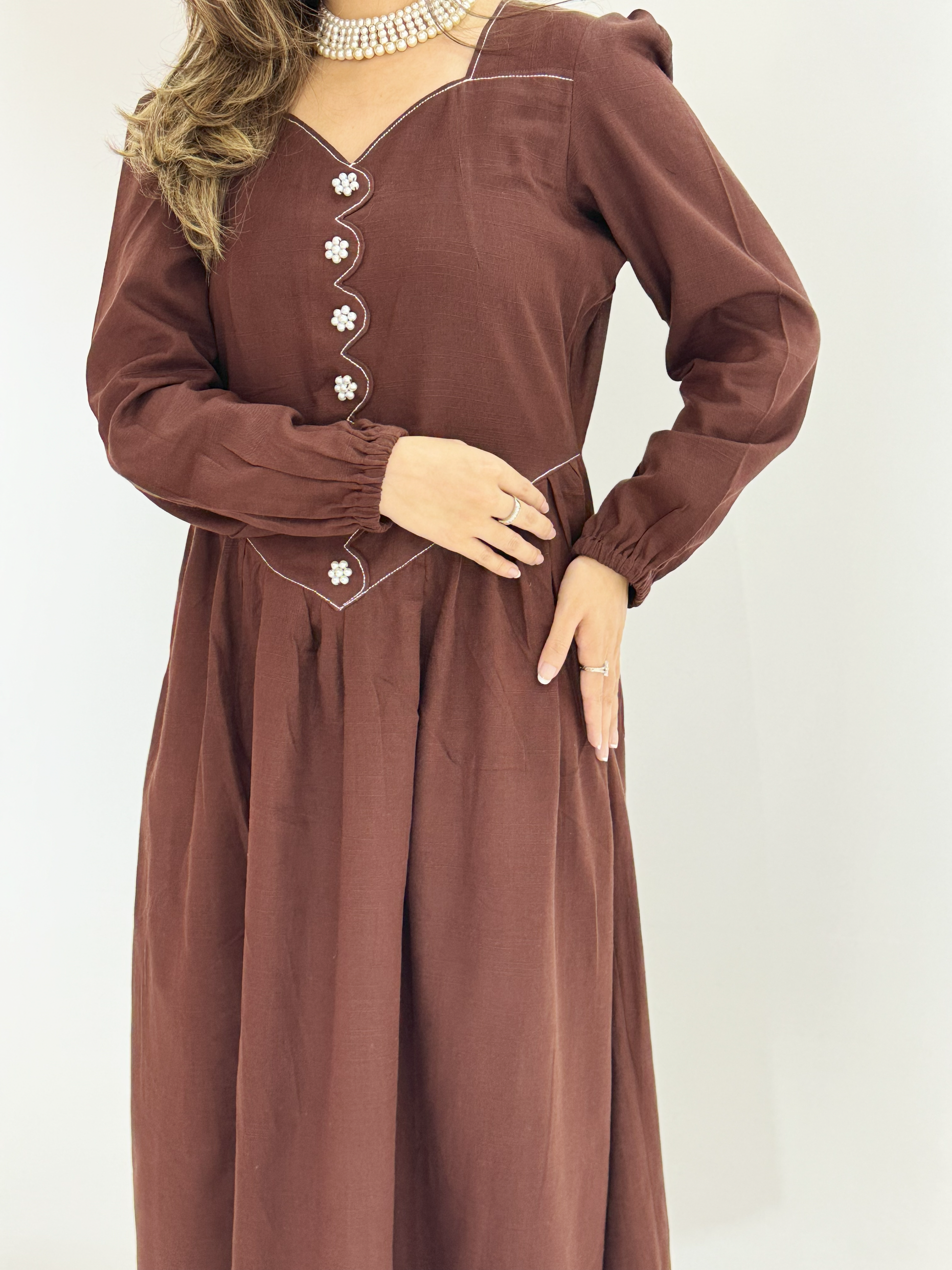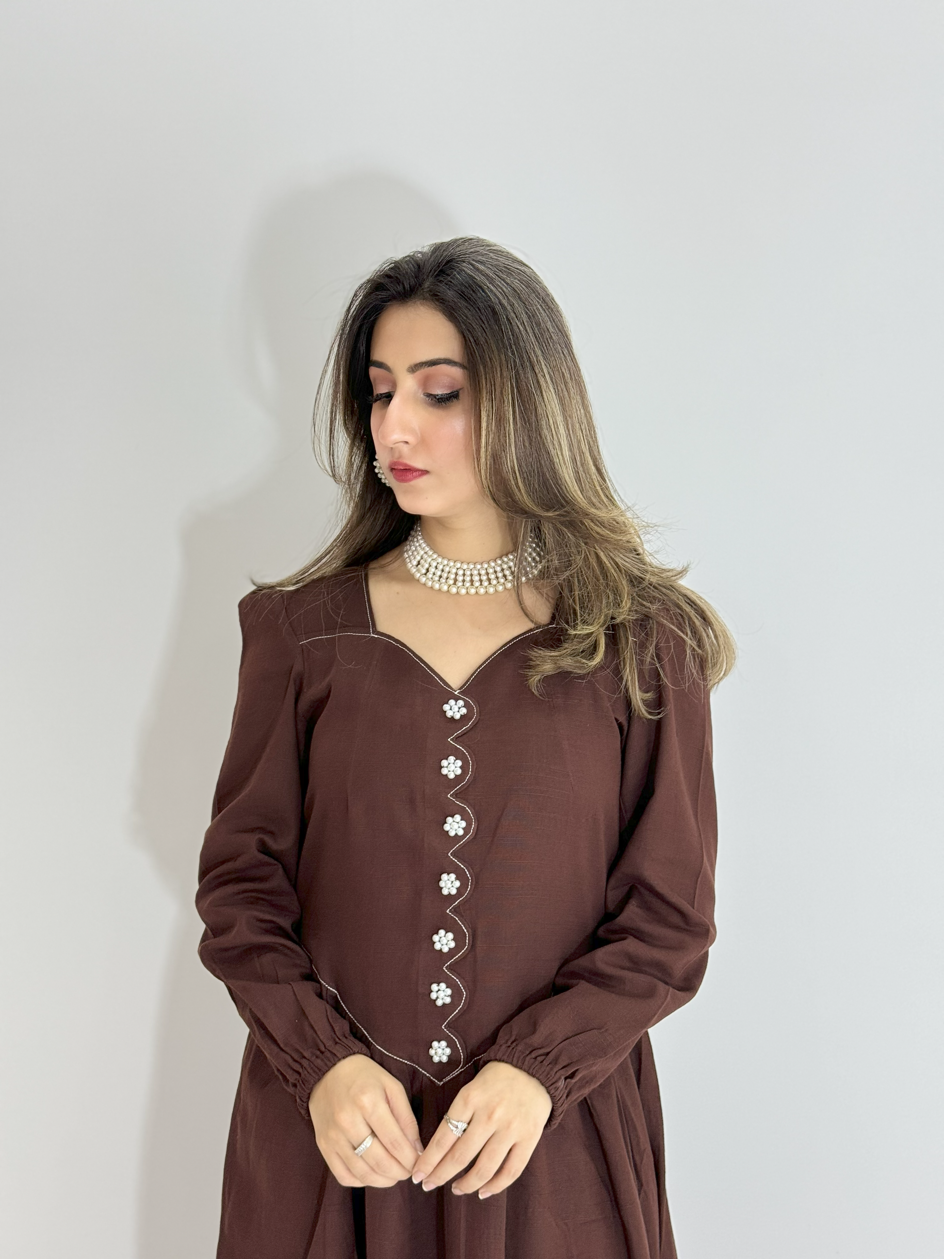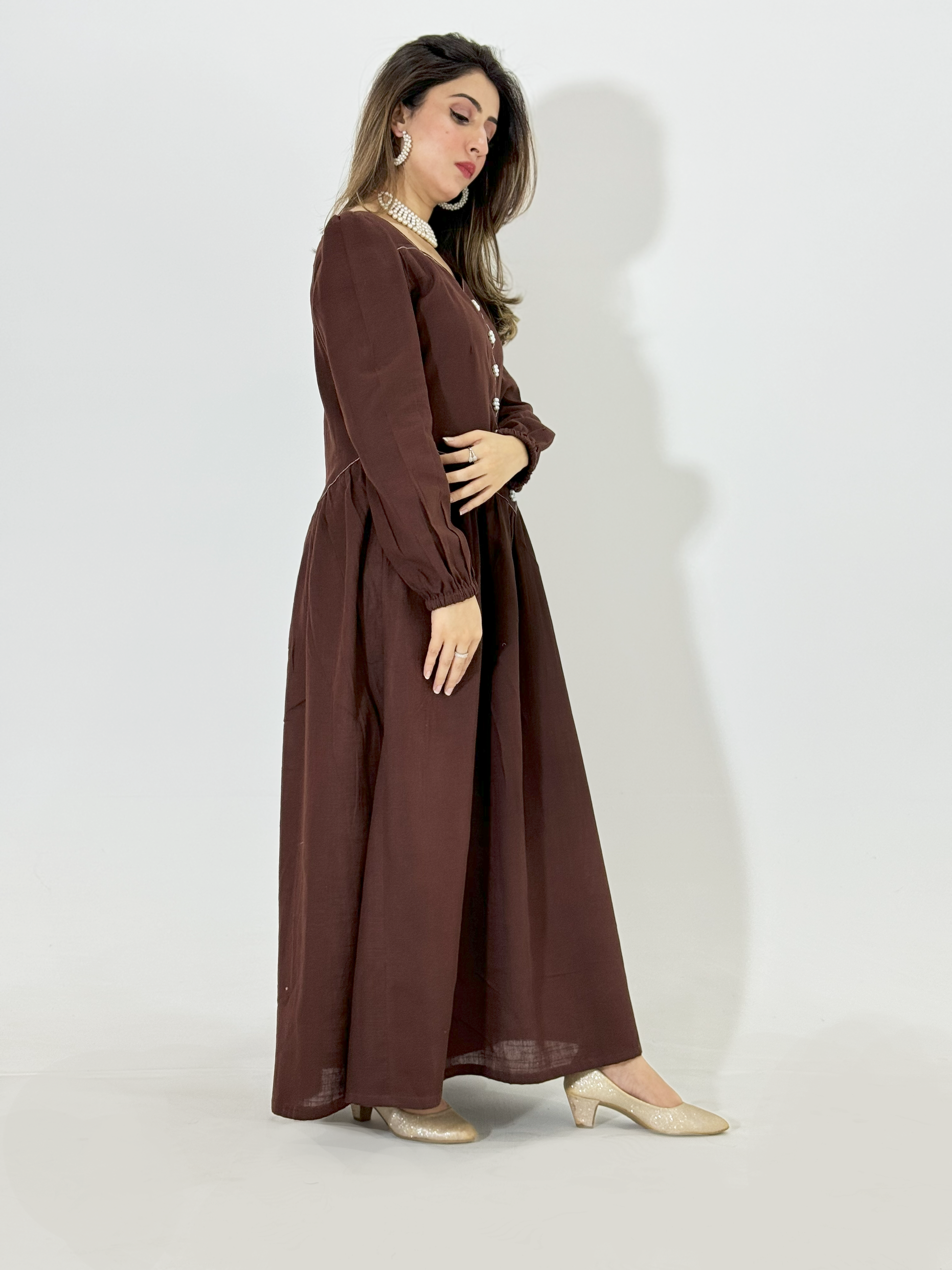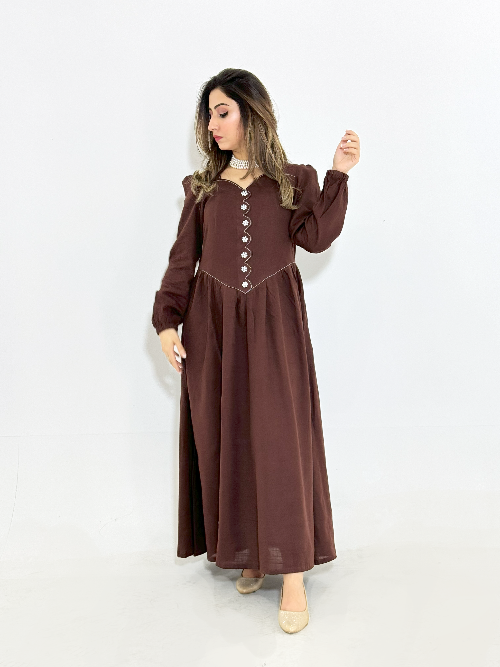 This elegant long frock in a rich chocolate brown hue is designed for timeless sophistication. Featuring a fitted bodice with intricate running stitch details and floral button embellishments, it exudes understated charm. The empire waist flows into a voluminous, floor-length skirt, creating a graceful silhouette. Full-length puff sleeves add a vintage-inspired touch. Crafted from soft, lightweight khaddar fabric, it combines comfort with style for an effortlessly refined look.